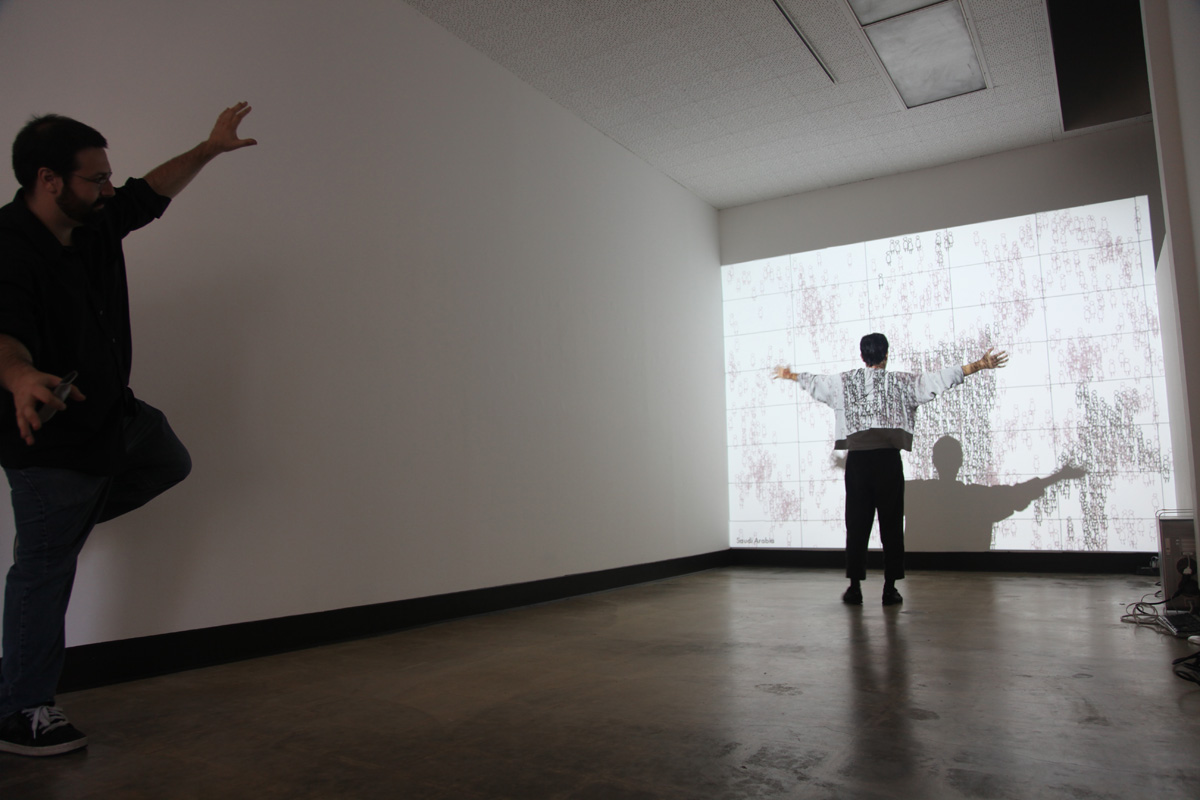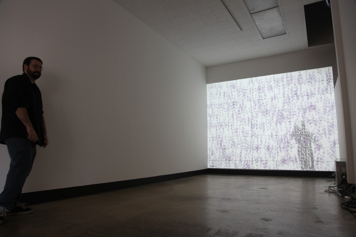 The software randomly cycles through approximately 200 countries, drawing the number of unemployed as aimless wanderers, ambling across the screen (as they are unemployed). Whenever a viewer enters the space of the installation, their silhouette is captured by a video camera. The software instructs the figures to inhabit that shape and move with it for the duration that they are in the camera's scope of view. The silhouette metaphorically becomes an available labor force as well as the visible presence of the jobless. When the viewer leaves the camera's frame the figures return to their urban wanderings. If the country has a large number of unemployed, there are enough figures to fill and move with numerous silhouettes. If the country has minimal unemployment the silhouette is only partially filled. Displaying the numerical statistics as figures allows for a powerful visualization, one that allows for immediate country comparisons that ultimately resonate differently than simple bar graphs.