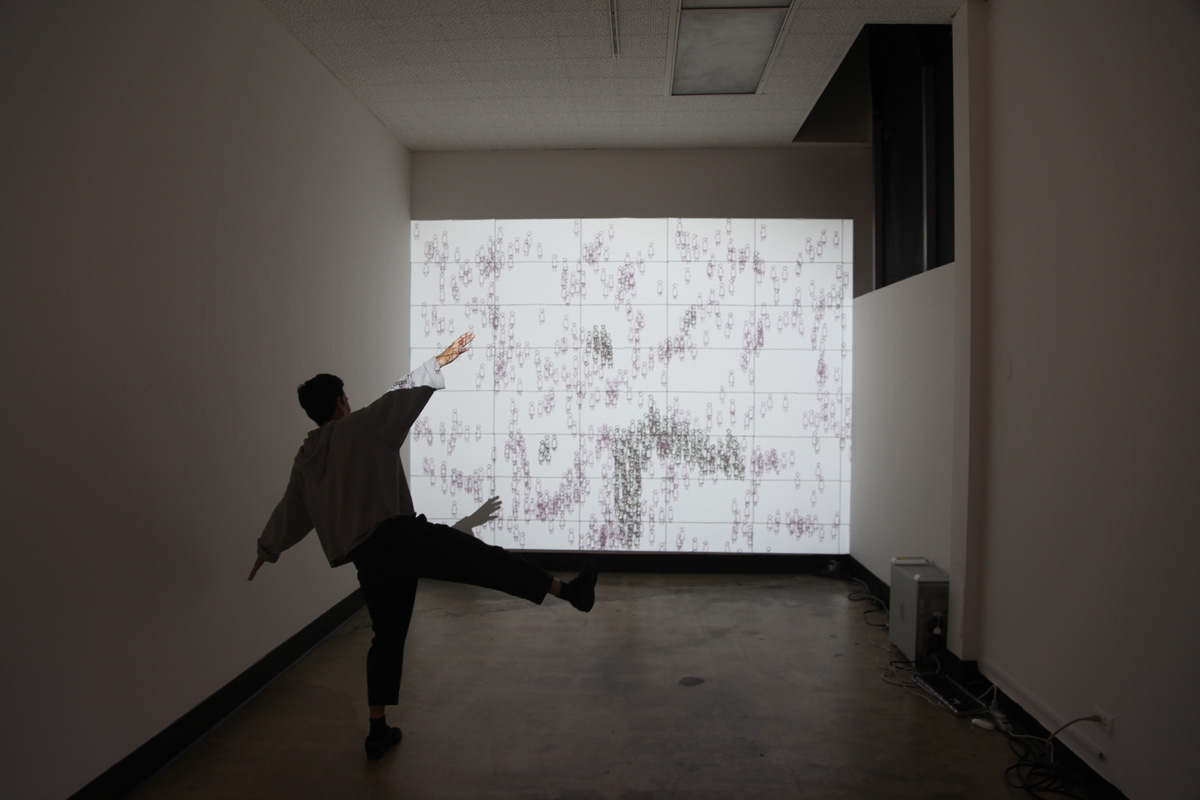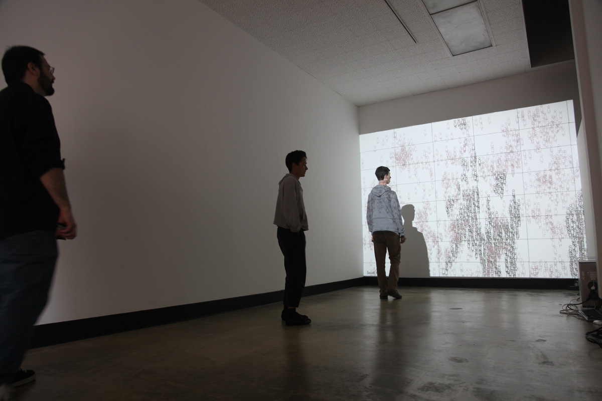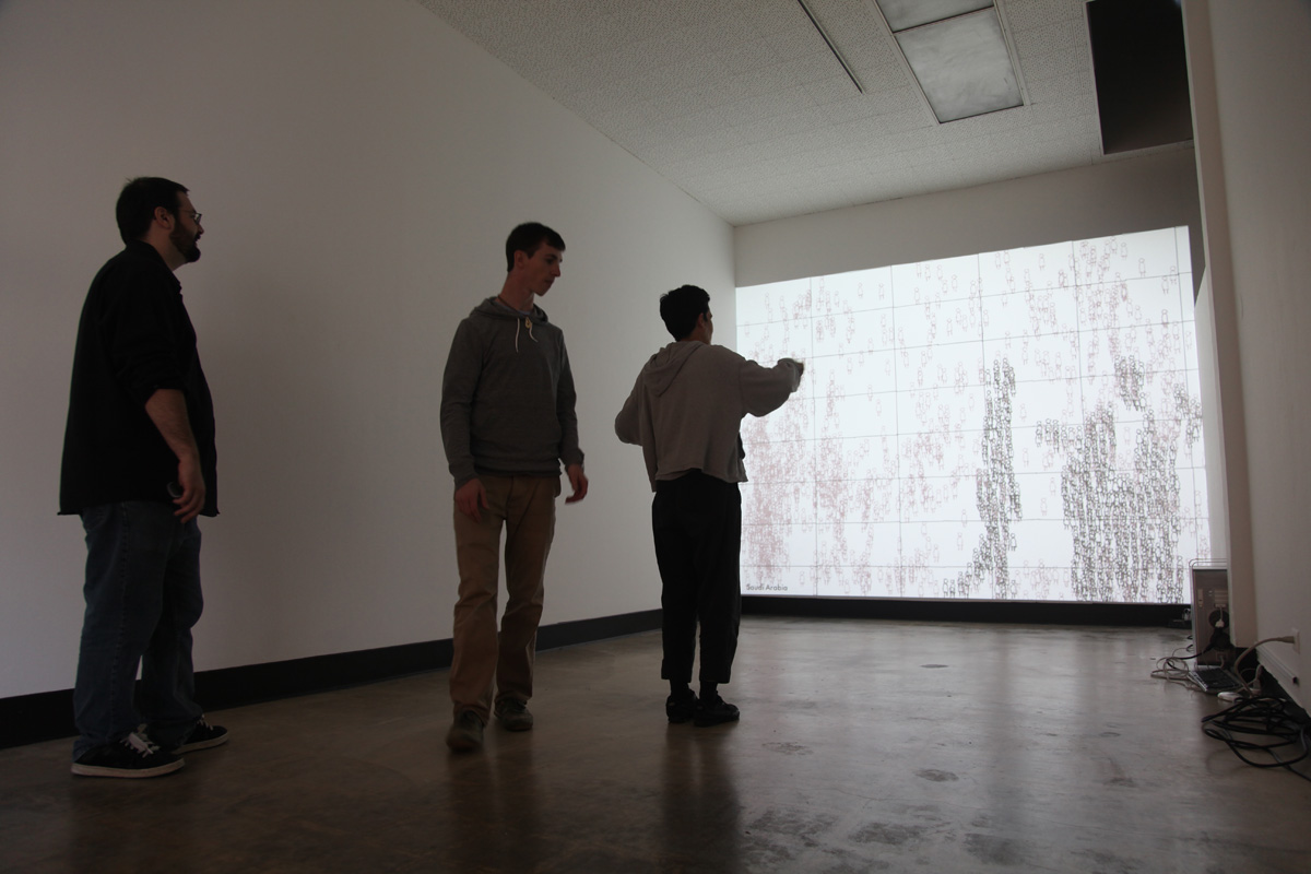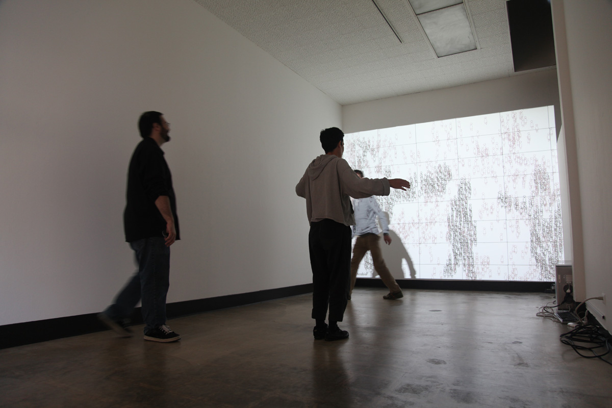 The software randomly cycles through approximately 200 countries, drawing the number of unemployed as aimless wanderers, ambling across the screen (as they are unemployed). Whenever a viewer enters the space of the installation, their silhouette is captured by a video camera. The software instructs the figures to inhabit that shape and move with it for the duration that they are in the camera's scope of view. The silhouette metaphorically becomes an available labor force as well as the visible presence of the jobless. When the viewer leaves the camera's frame the figures return to their urban wanderings. If the country has a large number of unemployed, there are enough figures to fill and move with numerous silhouettes. If the country has minimal unemployment the silhouette is only partially filled. Displaying the numerical statistics as figures allows for a powerful visualization, one that allows for immediate country comparisons that ultimately resonate differently than simple bar graphs.